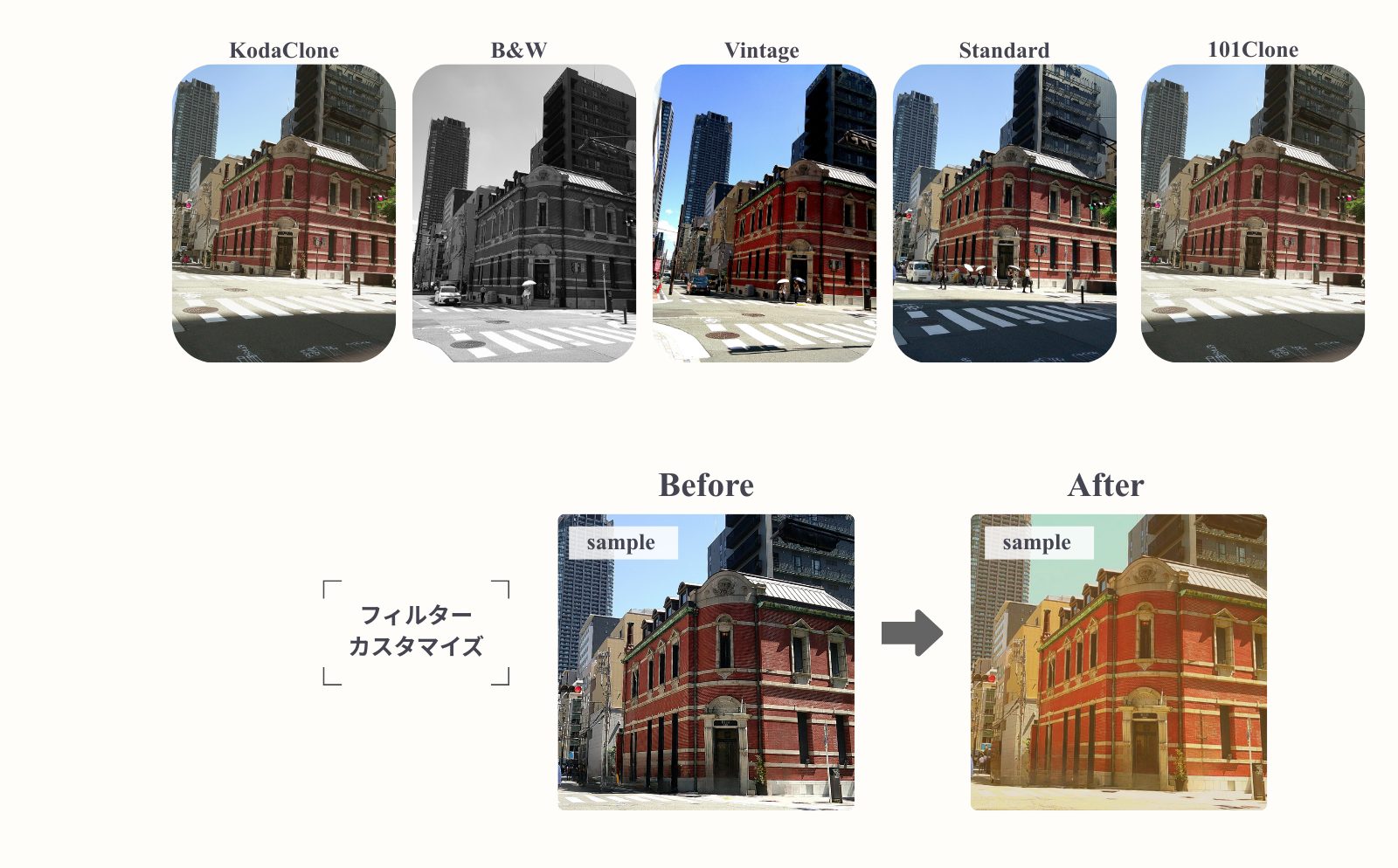 カメラにダウンロードできるさまざまなフィルターから、好みのスタイルを選んで撮影できます。